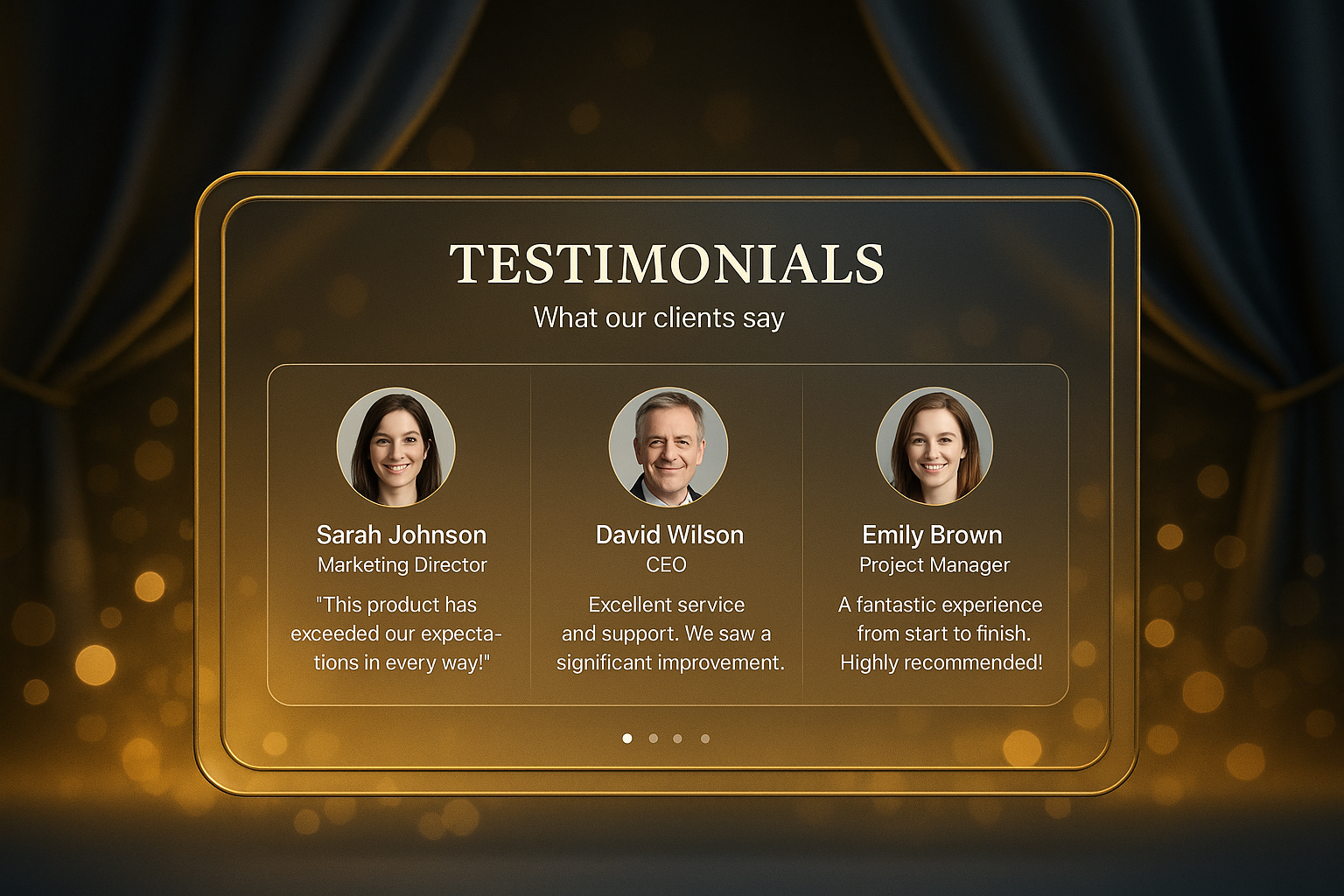 /Collection: /by davooda/Type: PNG/A sophisticated testimonials section featuring circular author photos, names, and quotes against a luxurious gold stage backdrop with a bokeh effect, ideal for marketing.