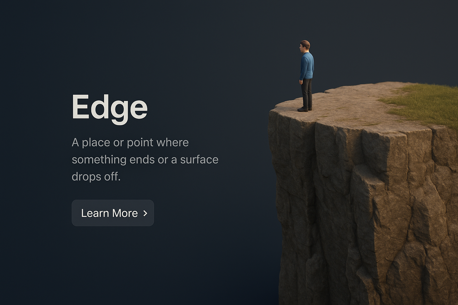 A zoomed-out 3D representation of a small figure standing on the edge of a cliff, with a dark gradient background. The scene includes a title and a brief description with a call-to-action button.
