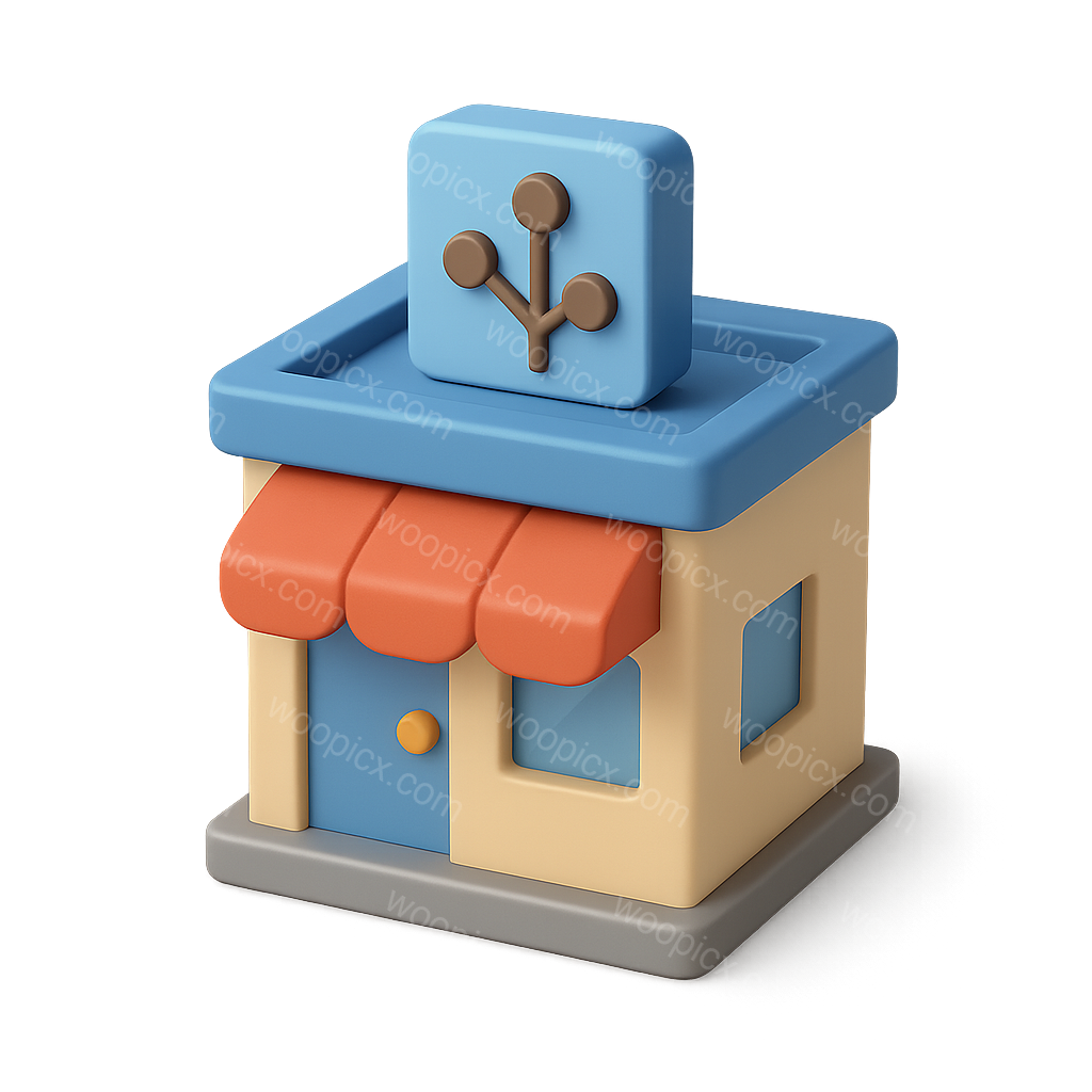/Premium/Collection: /by davooda/Type: PNG/A colorful 3D branch office icon featuring a blue roof, orange awnings, and a door with a unique branch design on top. The icon has a smooth, isometric appearance.
