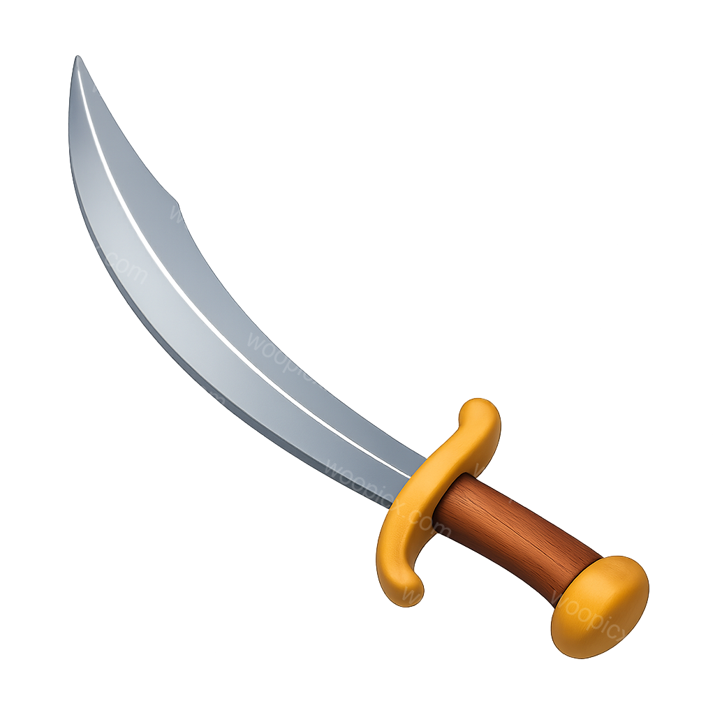 A vibrant 3D depiction of a sword featuring a curved blade, golden accents on the hilt, and a wooden handle, perfect for gaming or design projects.