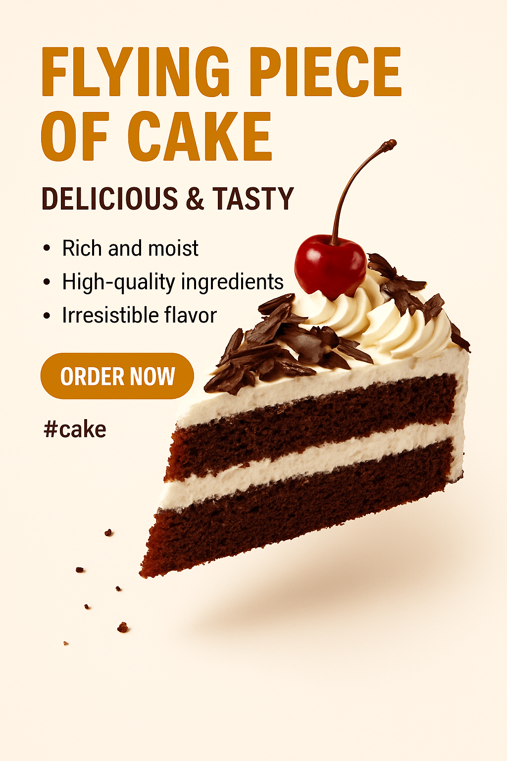 Vibrant promotional graphic showcasing a slice of cake that appears to be flying, designed to attract dessert lovers. Ideal for social media or food-related marketing.