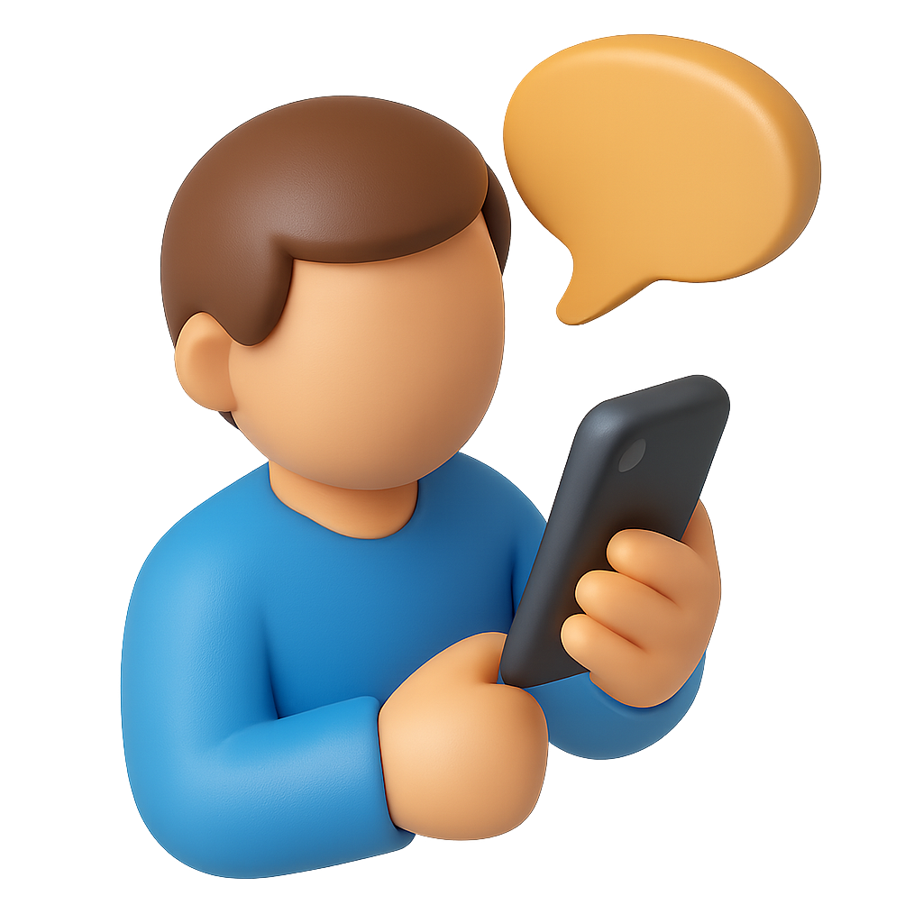A 3D icon depicting a person holding a smartphone while chatting. The design features a simple, isometric style with volumetric shapes and a transparent background.