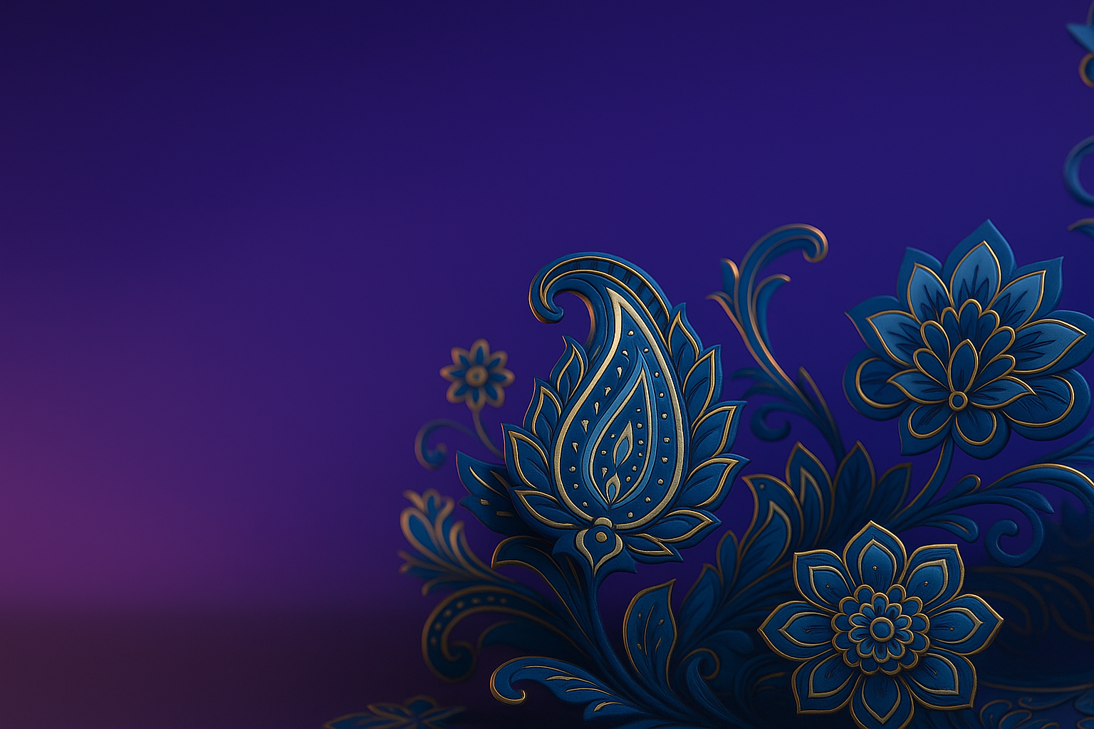 A beautifully designed floral ornament featuring intricate patterns and vibrant colors. The background transitions from deep purple to a more uniform hue on the left, ideal for text placement.
