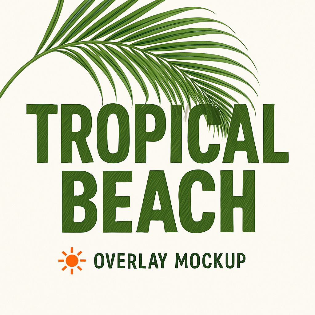Stylish overlay mockup featuring a tropical beach theme with bold typography and a palm leaf design, ideal for summer promotions and travel-related marketing.