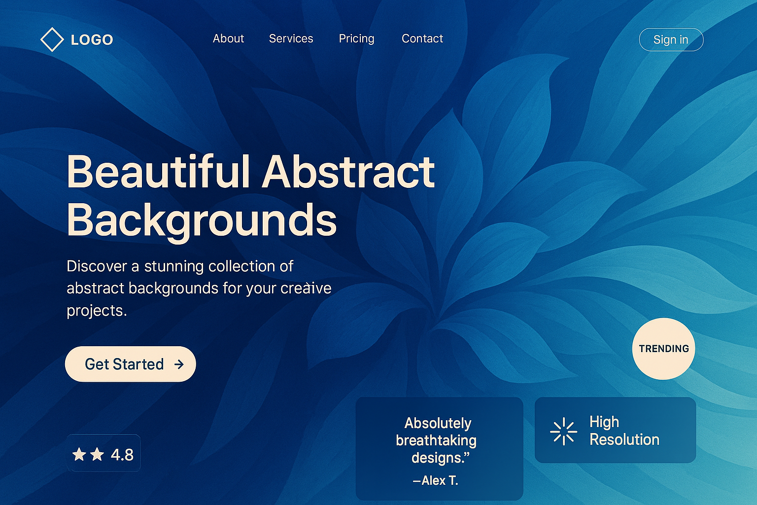 /Collection: /by davooda/Type: PNG/This image showcases a dynamic landing page design featuring an abstract blue background, a prominent logo, and various content blocks for services, pricing, and testimonials.