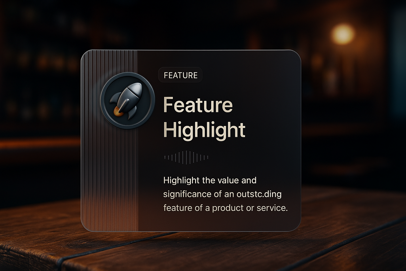 An empty wooden table in a vintage pub interior featuring a dark wood counter. A modern feature highlight block overlays the scene, showcasing design elements.