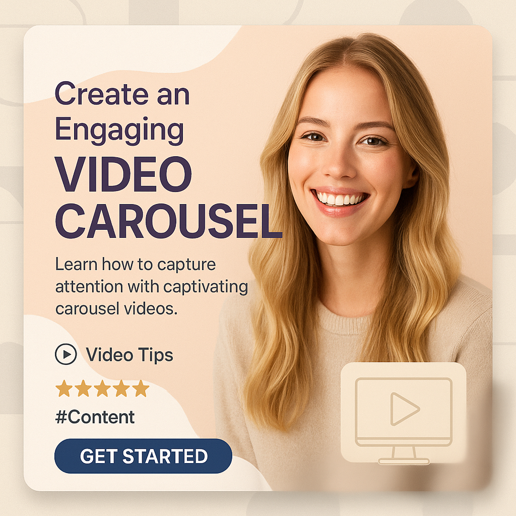 Attractive social media post designed to promote a video carousel tutorial, featuring a warm color palette and friendly imagery, ideal for content creators.