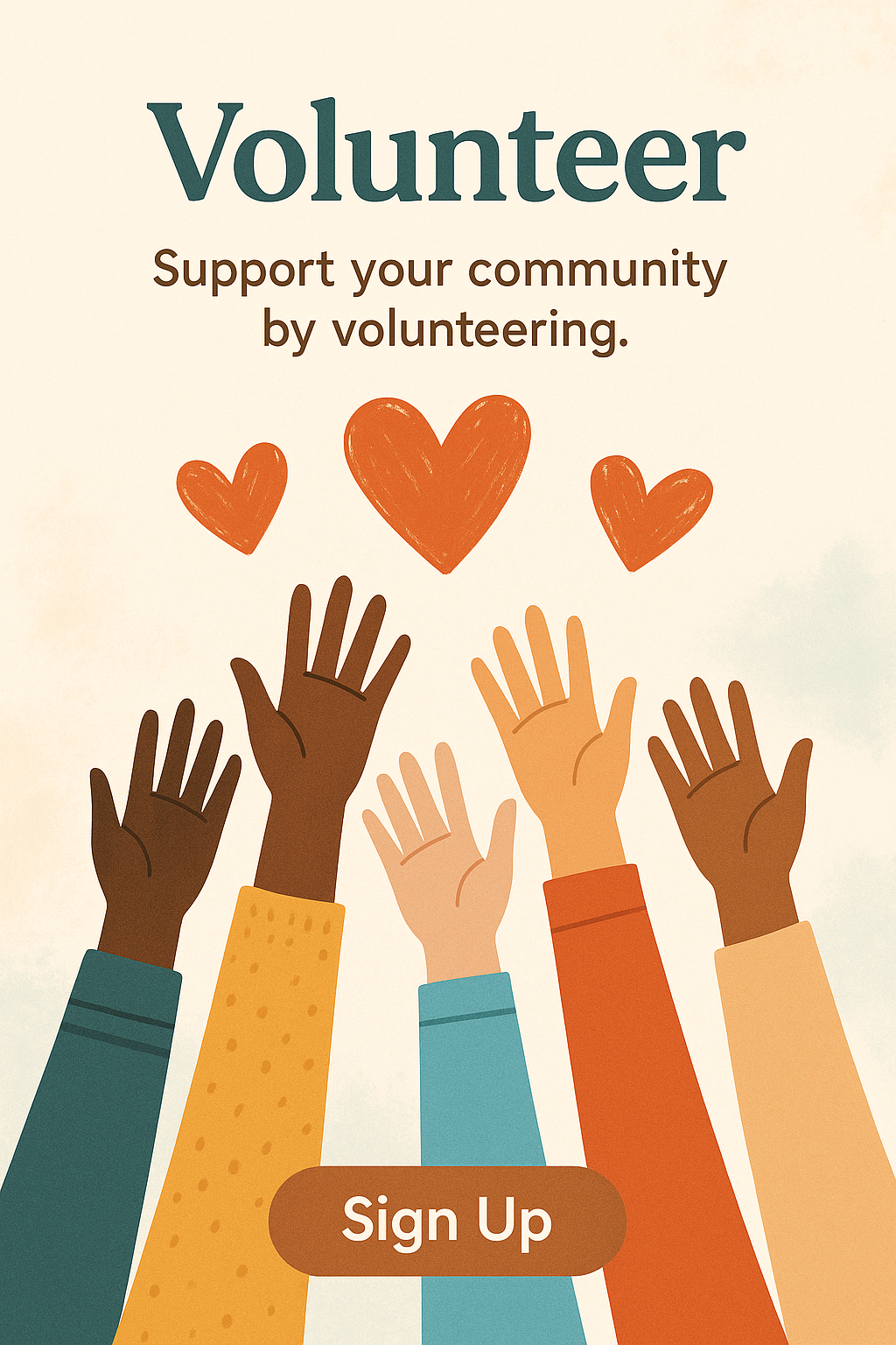 Illustrative graphic promoting community volunteering, featuring diverse hands raised with hearts. Ideal for social media or community outreach campaigns.