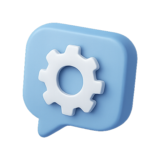 A three-dimensional icon featuring a gear symbol within a speech bubble, ideal for representing settings or technical support in digital interfaces.
