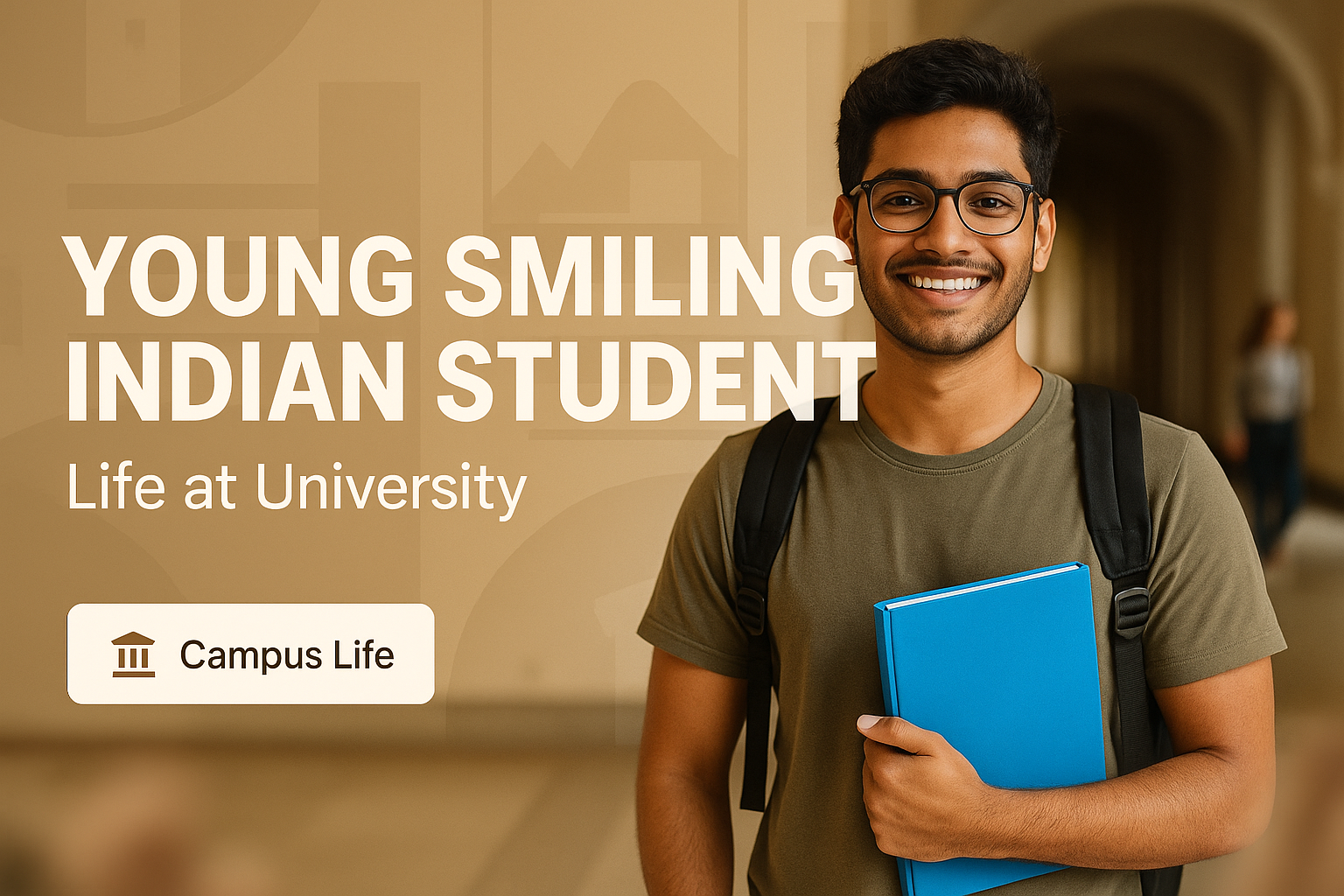 Vibrant portrait of a young smiling student in a university environment, ideal for educational content and campus life promotion.