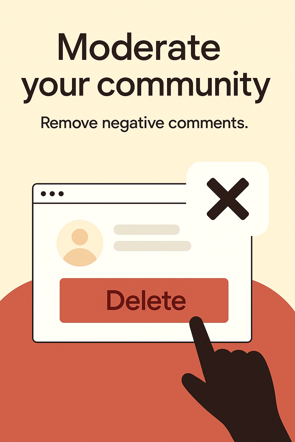 Informative graphic illustrating the concept of community moderation, emphasizing the action of removing negative comments. The design features a hand pointing at a delete button with a clean, modern aesthetic.