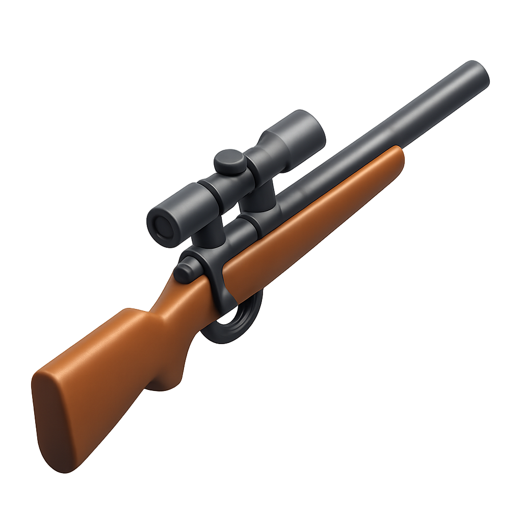 A stylized 3D representation of a sniper rifle featuring a wooden stock and a sleek barrel. The scope is prominently displayed, enhancing its design.
