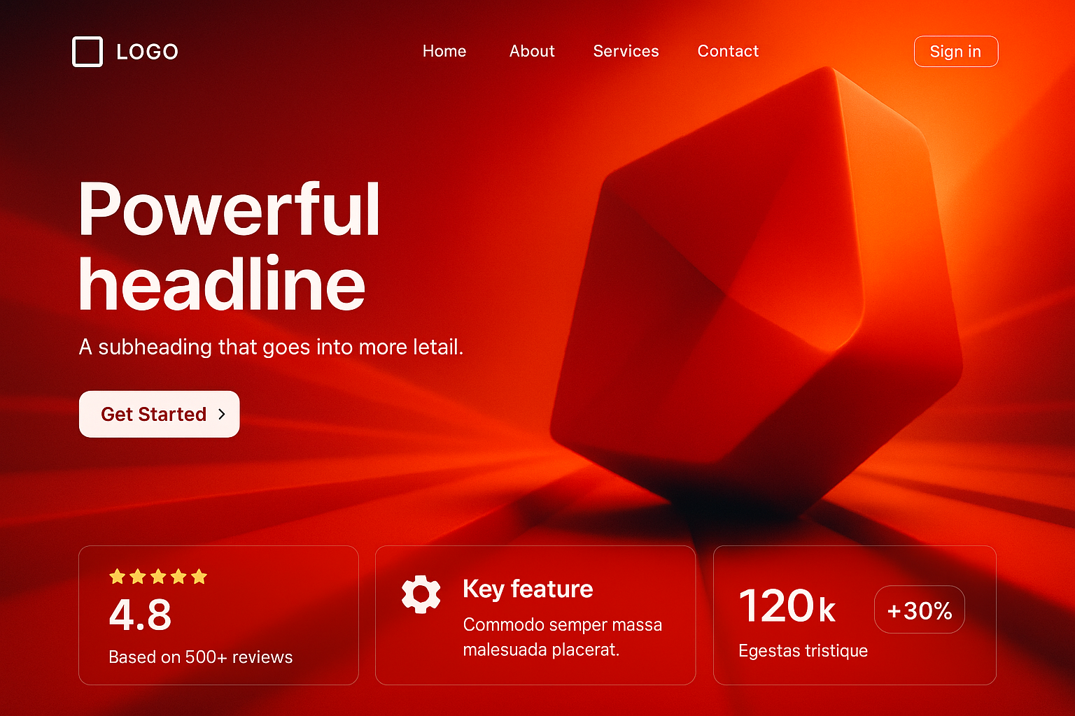/Collection: /by davooda/Type: PNG/A striking minimalist landing page layout featuring a geometric logo, bold headlines, and vibrant red gradient background. Key features highlighted with icons and ratings.