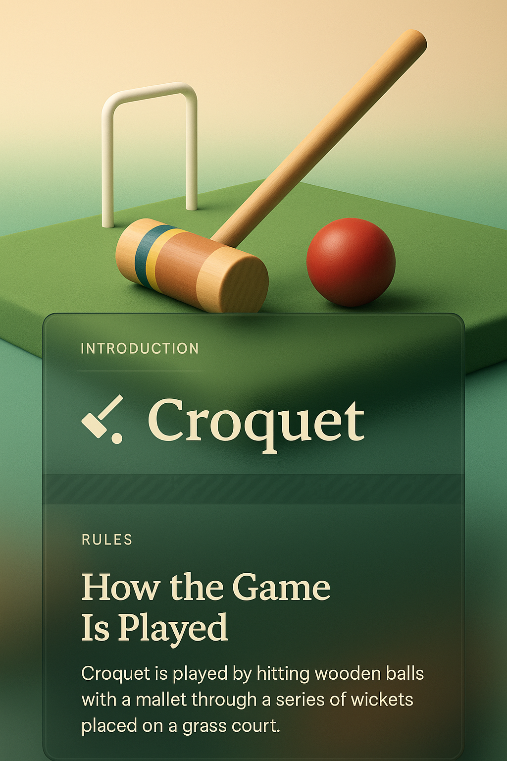 /Collection: /by davooda/Type: PNG/A detailed 3D illustration of croquet featuring a mallet, ball, and grass court. The design integrates informative panels with a smooth gradient background, ensuring clarity and cohesion.