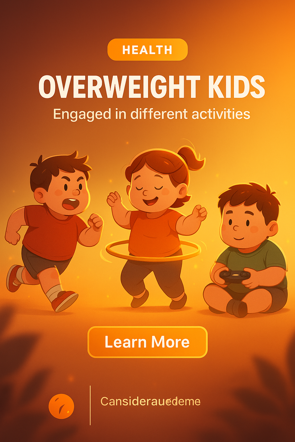 This vibrant social media post illustrates overweight kids participating in various activities. Its cheerful design aims to promote health and wellness.