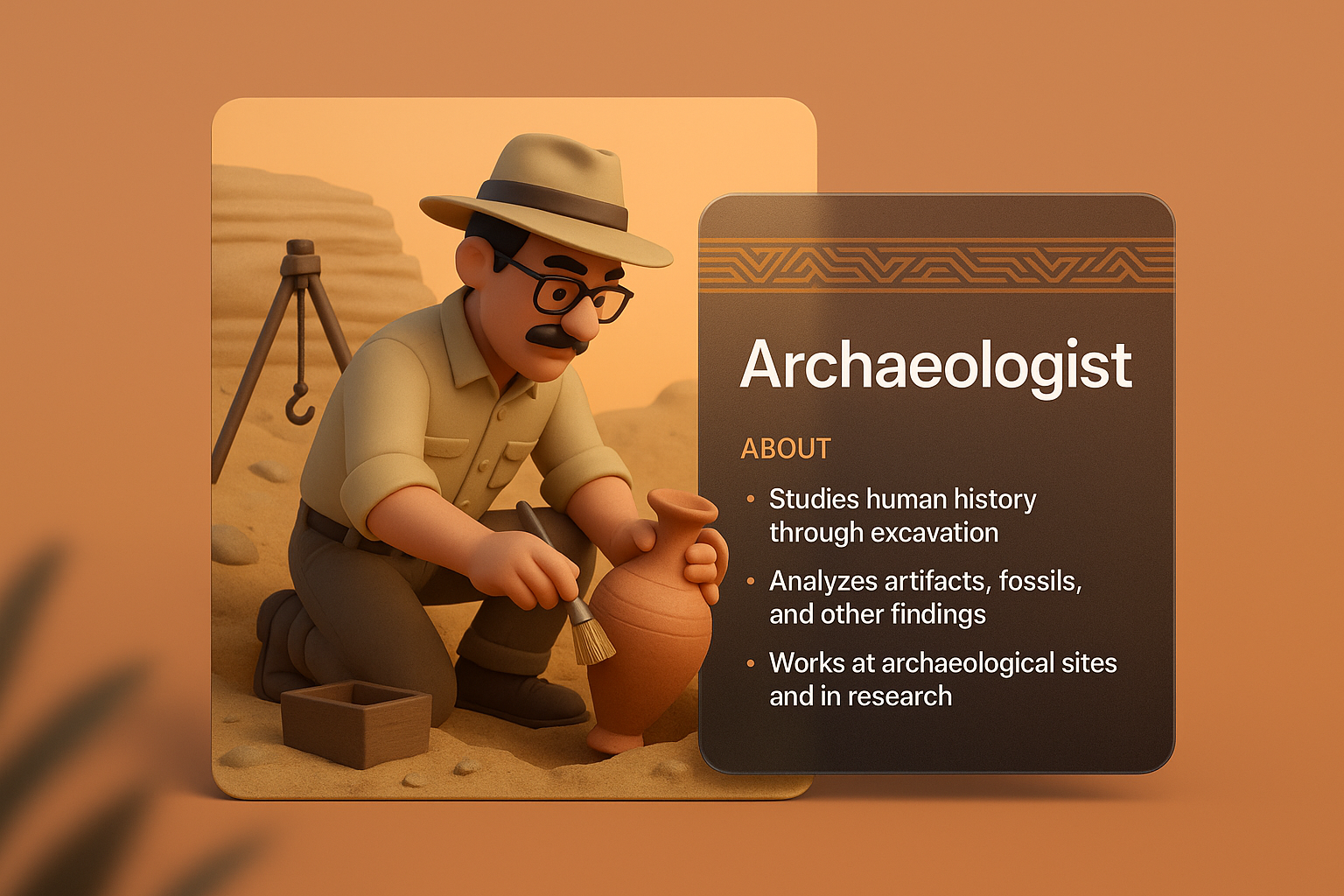 /Collection: /by davooda/Type: PNG/A 3D depiction of an archaeologist working meticulously with a pottery artifact in a sandy excavation site. The design features a layered composition with informative text.