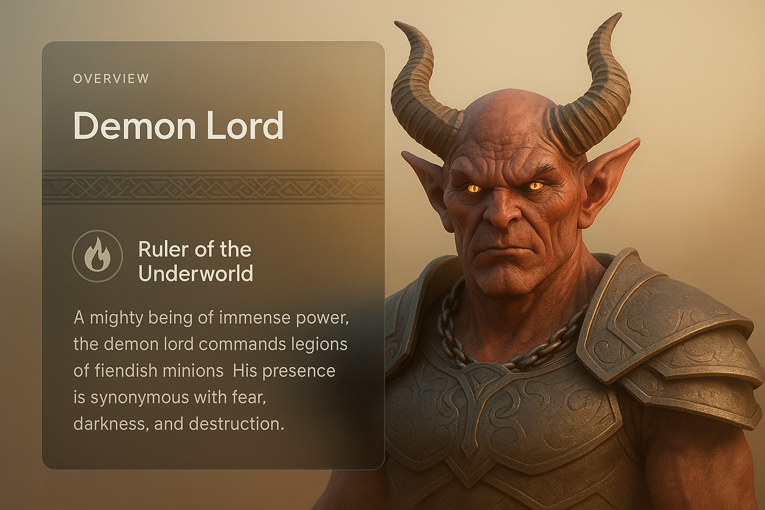 /Collection: /by davooda/Type: PNG/This image features a formidable demon lord, showcasing his intimidating presence and intricate details. The design includes an integrated informational panel with a smooth gradient background.