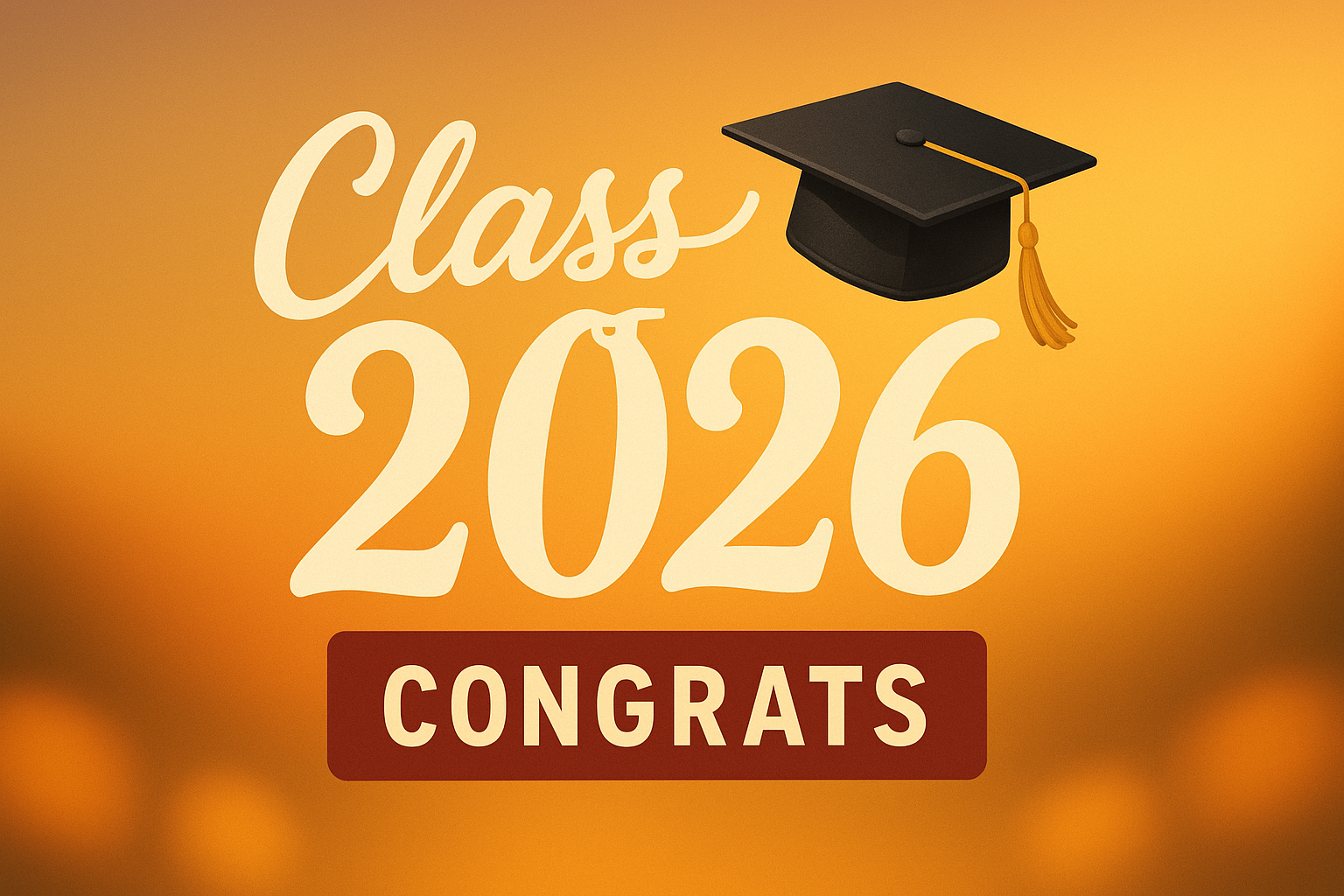 Festive graduation announcement graphic showcasing Class of 2026 with a graduation cap, designed for congratulatory messages and social media sharing.