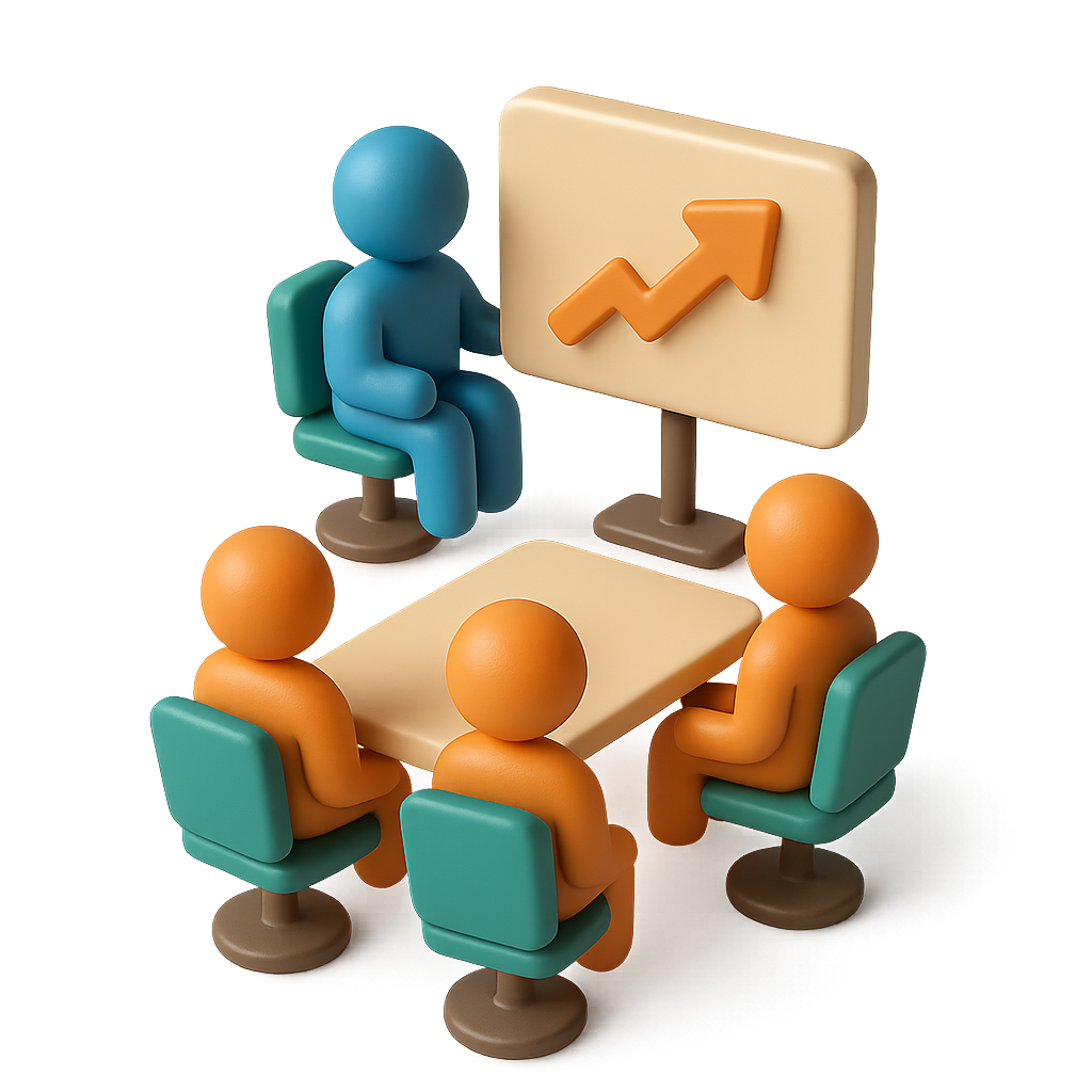 A 3D icon depicting a board meeting scene, featuring four stylized figures around a table and a presentation screen showing an upward trend graph.