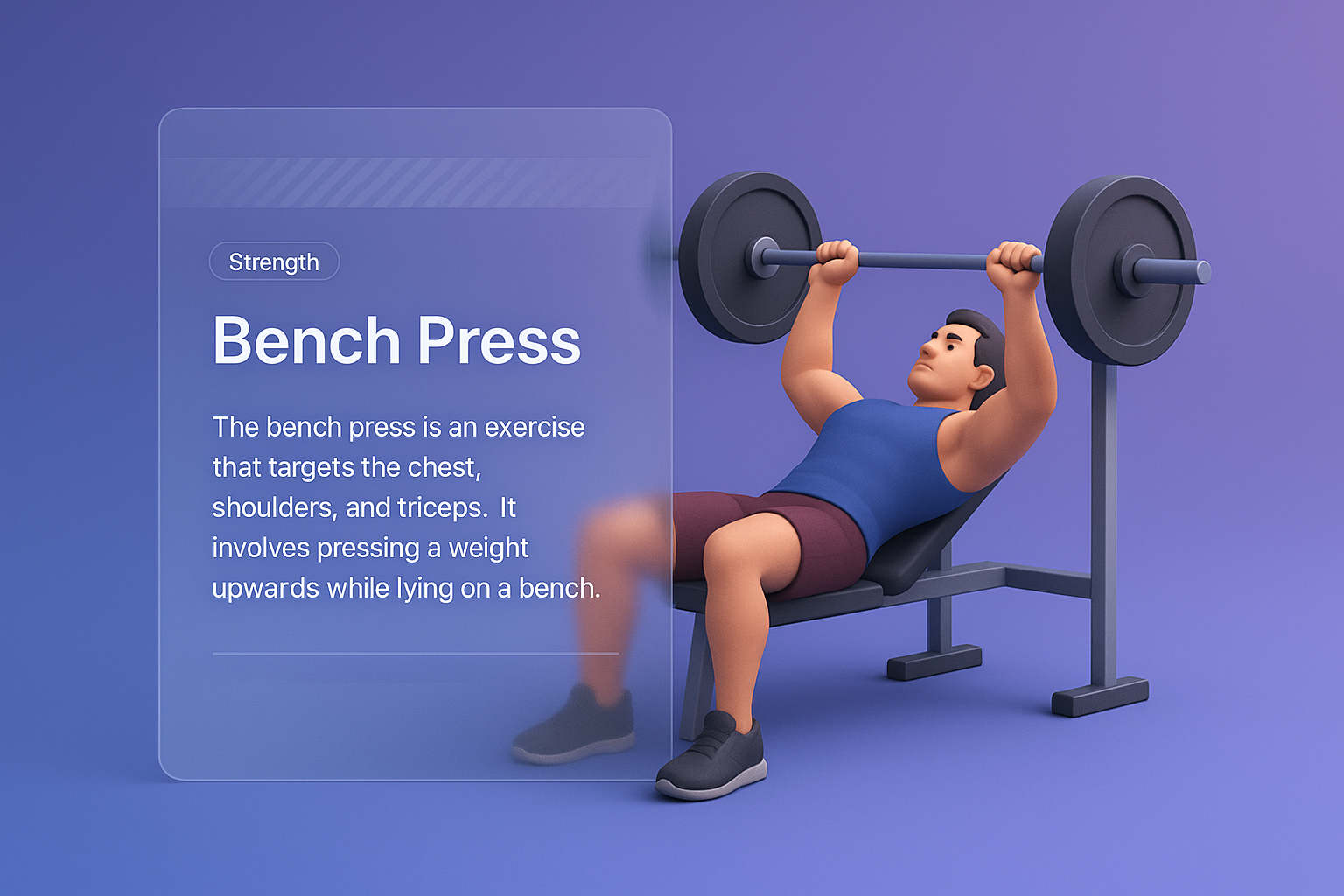 A vibrant 3D illustration depicting a man performing a bench press. The scene features a transparent glass block with text, enhancing the modern look.