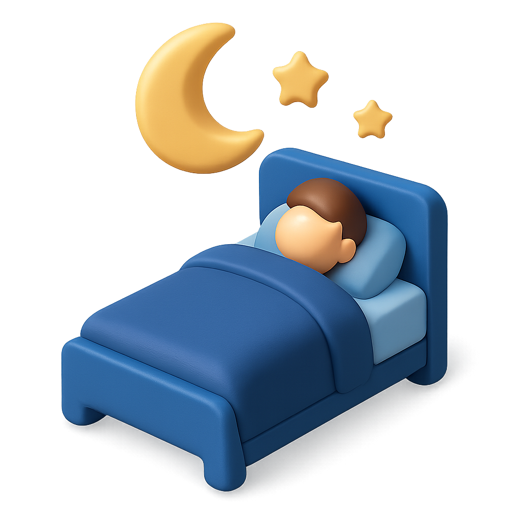 A 3D icon depicting a person resting in bed at night, featuring a blue bed, a moon, and three stars. The design has a transparent background and an isometric view.