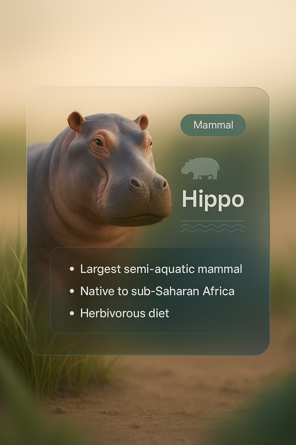 /Collection: /by davooda/Type: PNG/A visually striking 3D illustration of a hippo, featuring a translucent overlay with informative text about its habitat and diet. The design incorporates a soft gradient background, enhancing the main subject.