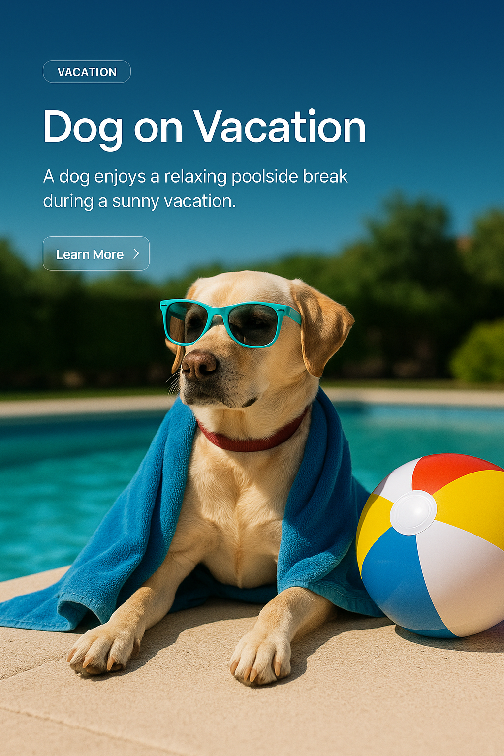 A cheerful dog wearing sunglasses relaxes by a swimming pool, draped in a towel. The vibrant scene captures the essence of a sunny vacation.