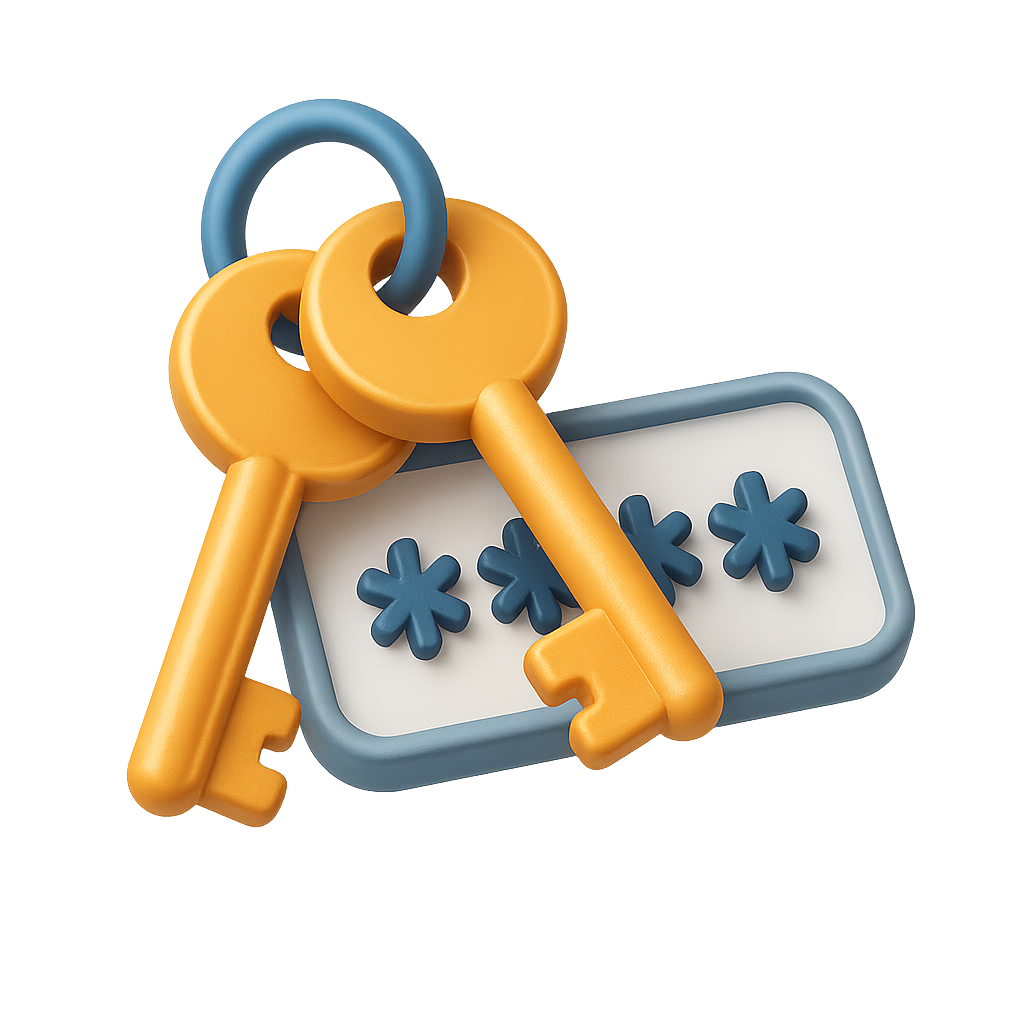 /Collection: /by davooda/Type: PNG/A vibrant 3D illustration displaying two colorful keys and a password field. The keys are orange and blue, set against a smooth, dark background, emphasizing their 3D design.