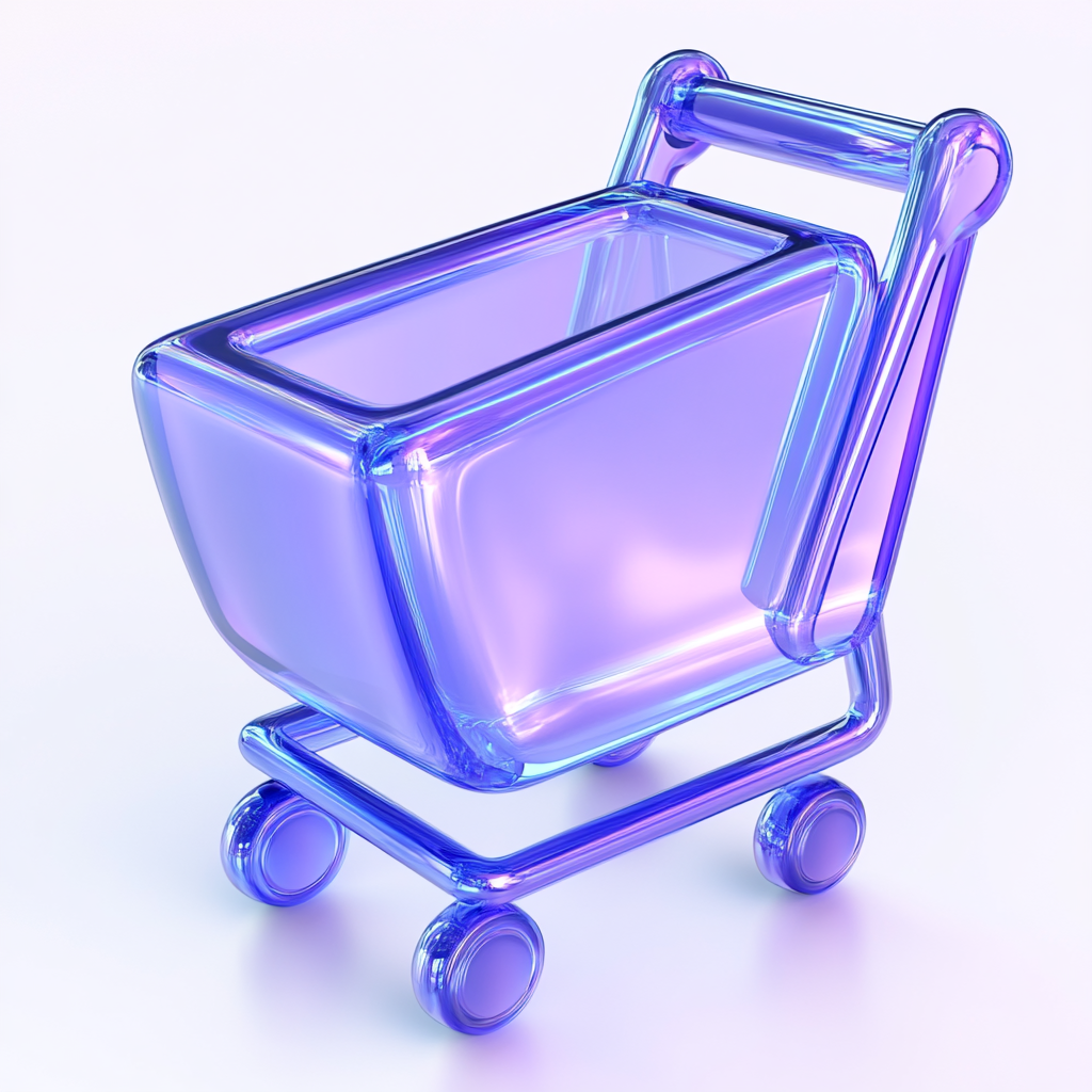 A visually striking 3D rendered shopping cart icon with a transparent and glossy finish, suitable for e-commerce websites or mobile applications.