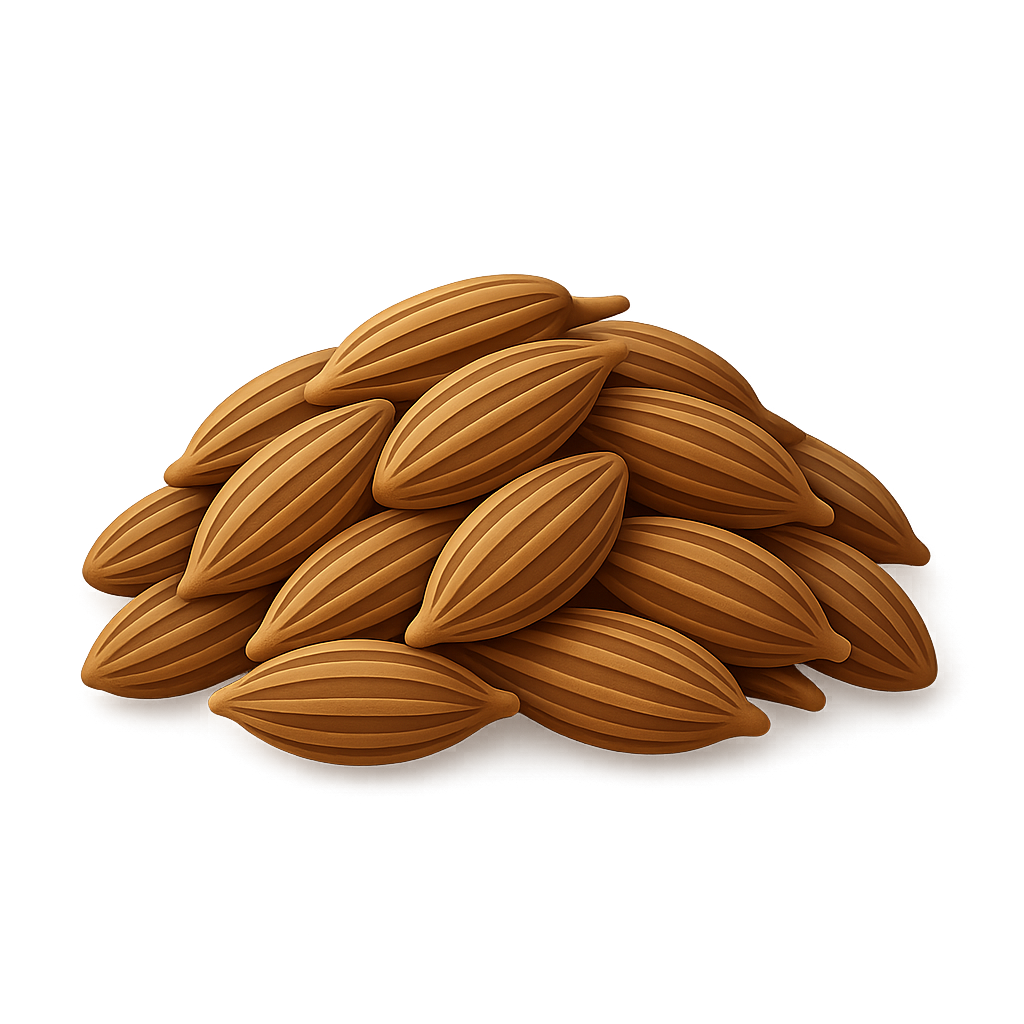 A visually appealing 3D icon representing a pile of brown seeds with distinct ribbed texture. The seeds are arranged in a mound, showcasing their natural color and shape.