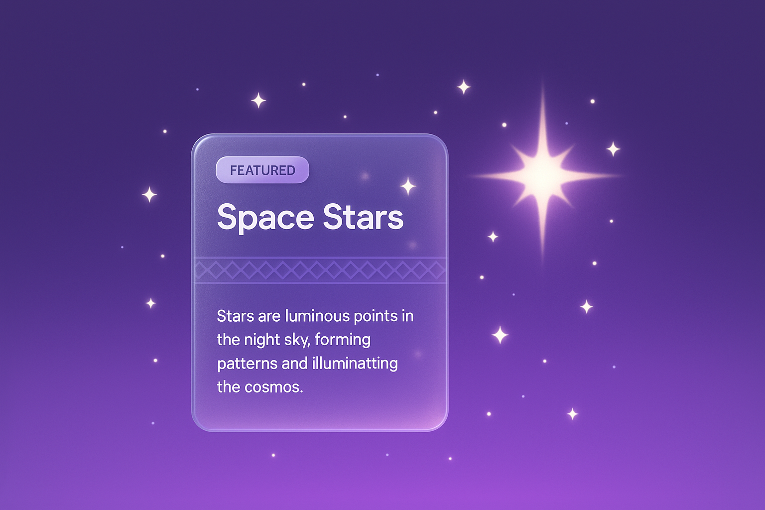 A vibrant illustration featuring glowing stars against a gradient purple background. The design includes a transparent block with text describing space stars, enhancing the cosmic theme.