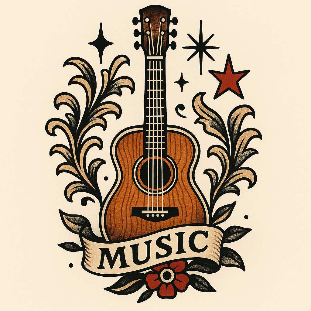 Vintage Music-Themed Illustration with Guitar and Floral Elements