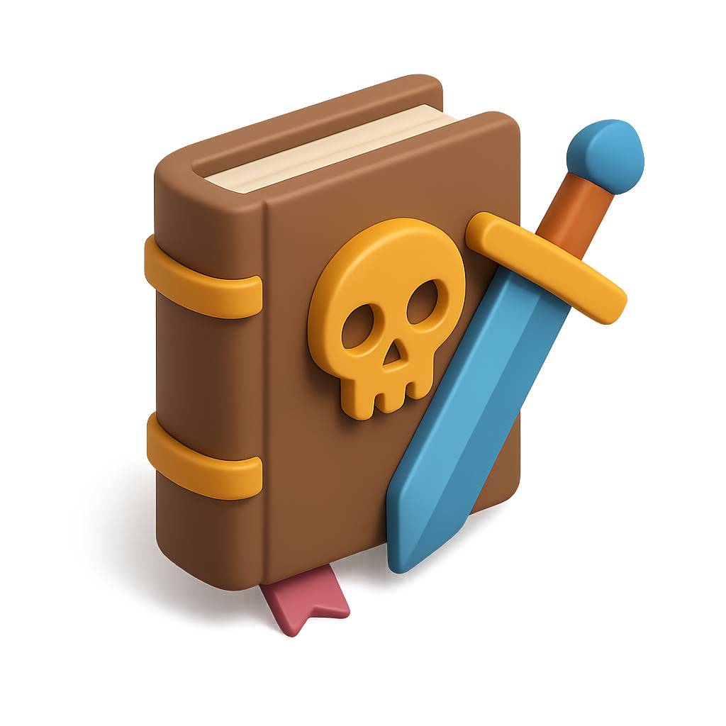 /Collection: /by davooda/Type: PNG/A colorful 3D icon depicting a brown book with a skull emblem and a blue sword. The design features a transparent background and a three-quarter isometric view, enhancing its volumetric appearance.