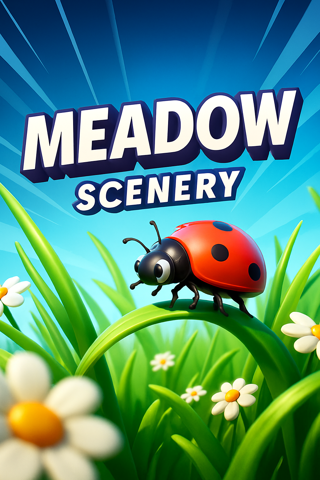/Collection: /by davooda/Type: PNG/A lively illustration of a meadow featuring a bright ladybug on a green blade of grass, surrounded by white daisies. The background has a smooth gradient transitioning to a vivid blue sky, enhancing the dynamic feel of the scene.