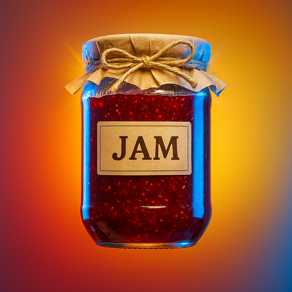 A beautifully illuminated jar of jam, suspended in mid-air against a smooth gradient background. The jar features a classic label and is highlighted from behind, creating a striking visual effect.