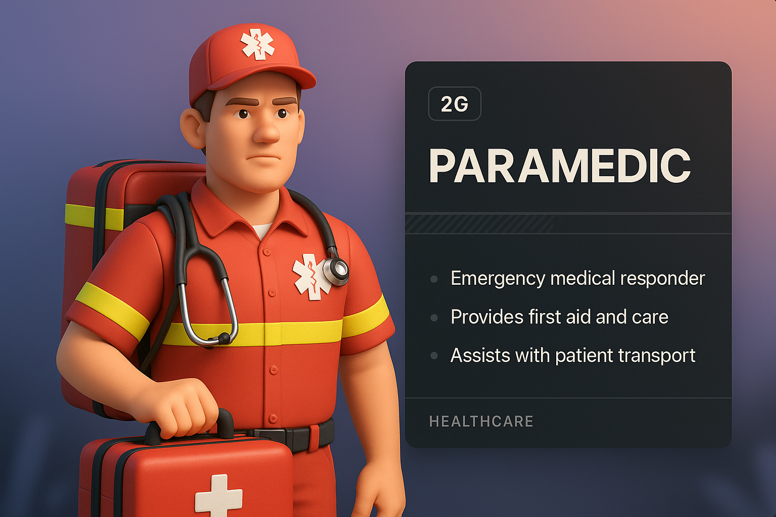 /Collection: /by davooda/Type: PNG/A 3D illustration of a paramedic in a vibrant uniform, featuring a medical bag and stethoscope. The design incorporates a dark panel with key information about emergency medical services.