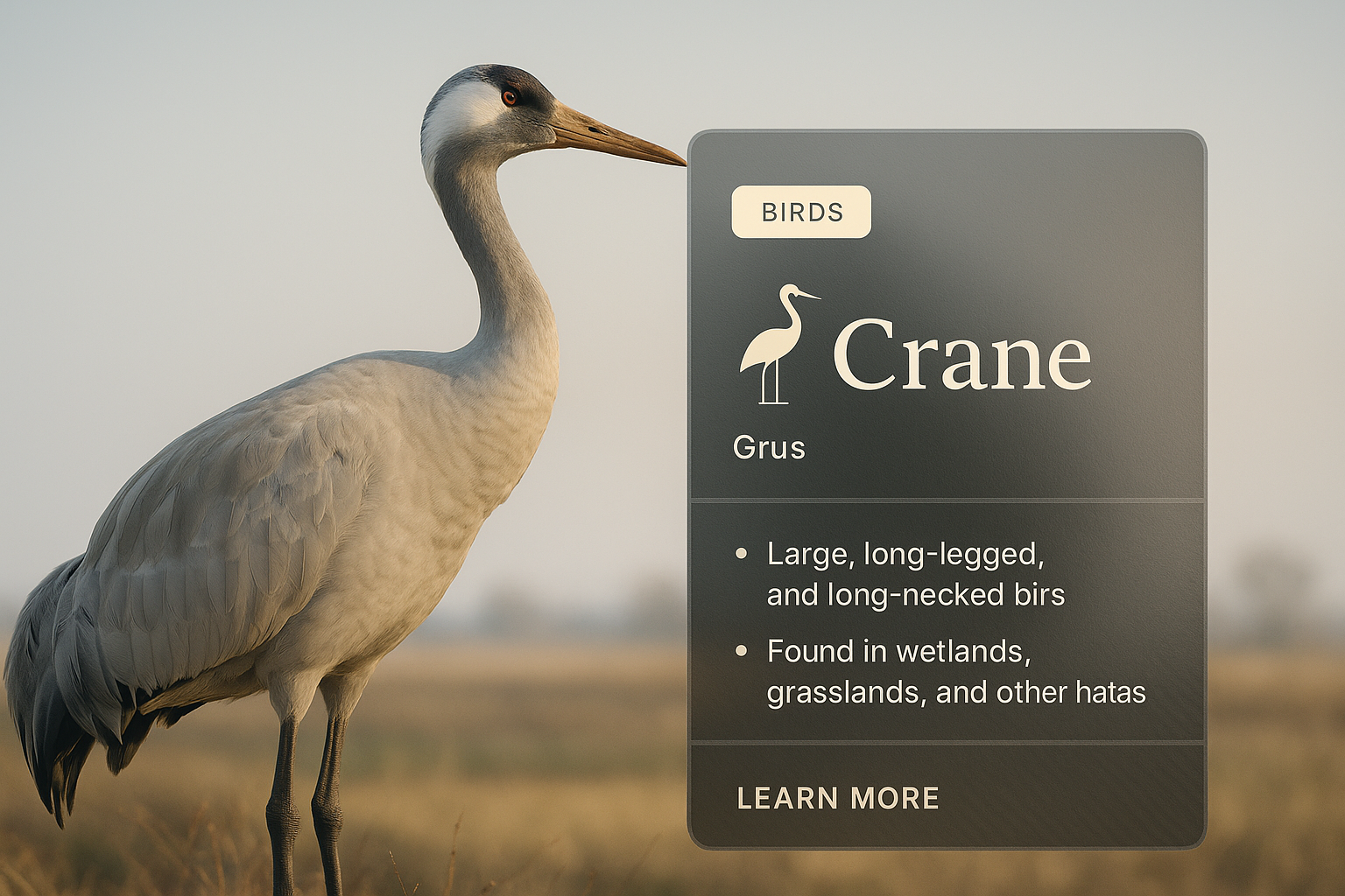/Collection: /by davooda/Type: PNG/This image features a striking crane standing gracefully in a natural setting, accompanied by an informative overlay. The design integrates a light gradient background and a stylish block containing text.