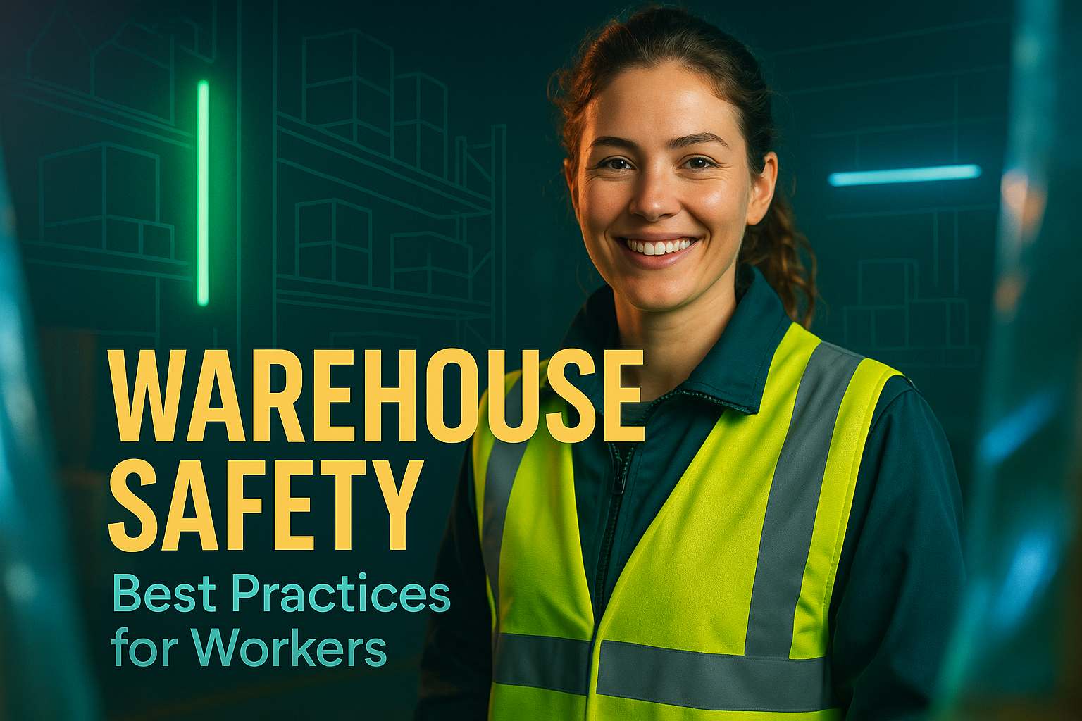 A visually engaging image promoting warehouse safety, showcasing a smiling worker in a high-visibility vest. Ideal for safety training materials and workplace awareness campaigns.