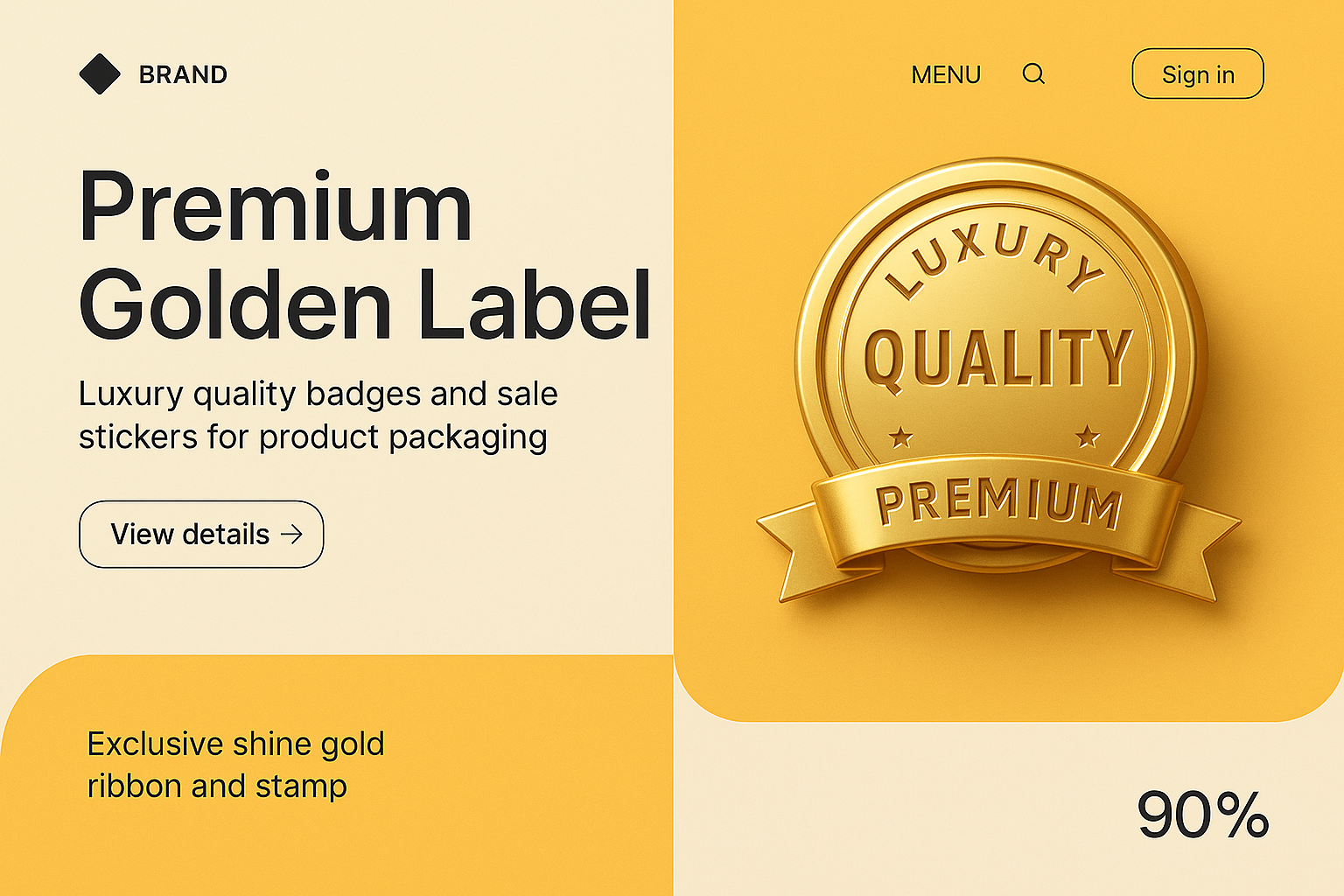 A modern and professional design featuring a premium golden label with luxury quality badges, set against a bright, geometric background. Typography is clear and balanced, emphasizing clarity.