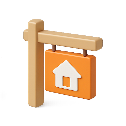 A stylized 3D house icon displayed on a for sale sign, featuring a modern design with soft colors and a minimalist aesthetic, ideal for real estate marketing.
