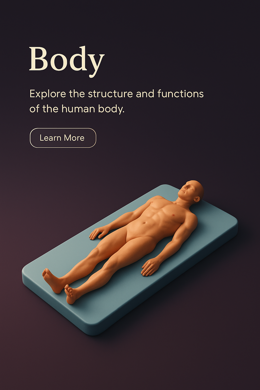 A detailed 3D scene showcasing a human body model on a platform, set against a dark gradient background. Text elements invite exploration of body structure.