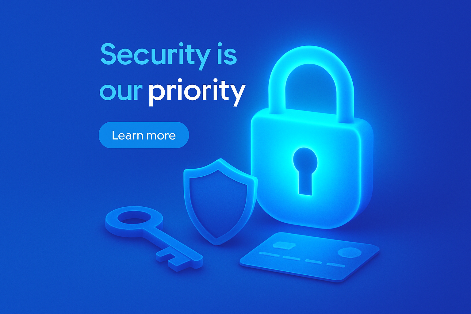 /Collection: /by davooda/Type: PNG/A vibrant scene showcasing security-themed objects like a padlock, shield, key, and credit card. The glowing elements radiate blue and violet hues, enhancing the theme of safety.
