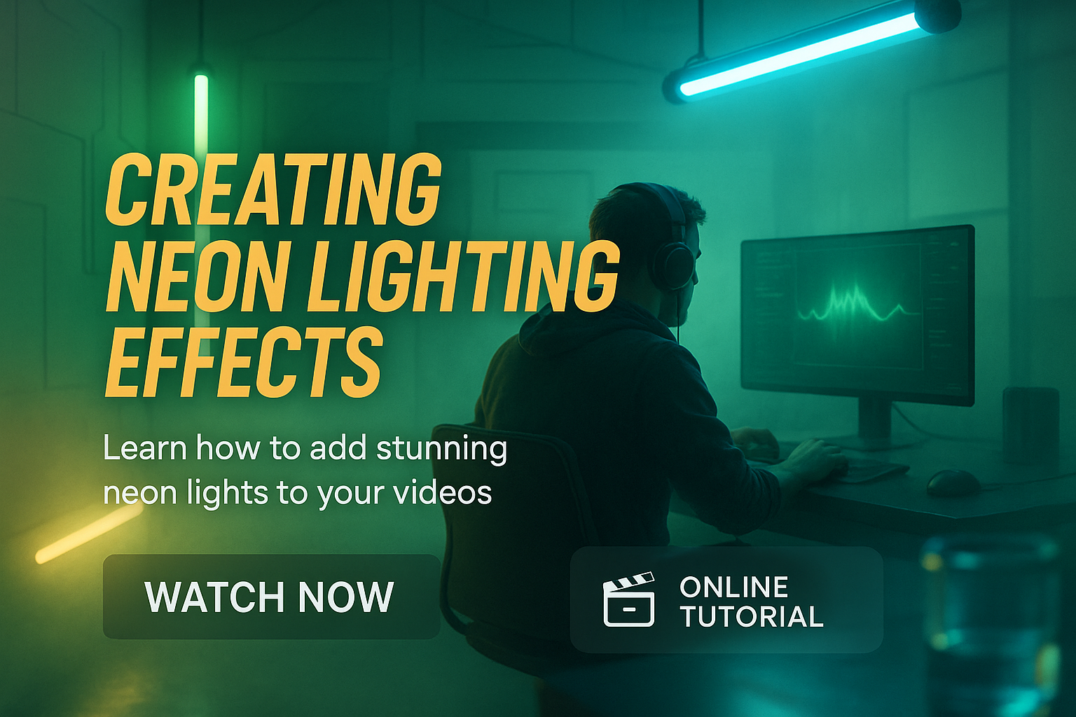 Informative online tutorial banner showcasing neon lighting effects for video editing. Engaging design with vibrant colors aimed at creative video producers.