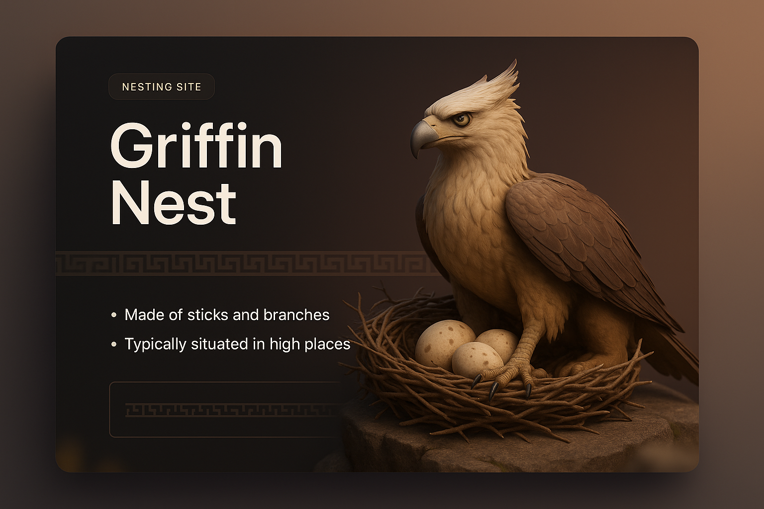 /Collection: /by davooda/Type: PNG/A 3D illustration of a griffin perched atop a nest made of sticks and branches, showcasing eggs. The image features a dark overlay with informative text about the nest's characteristics.