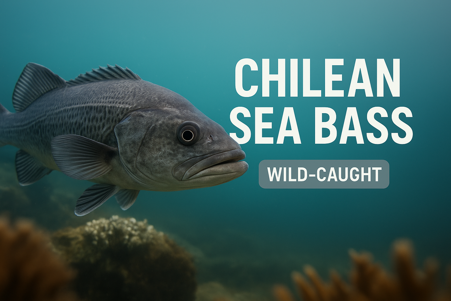 /Collection: /by davooda/Type: PNG/Captivating underwater photograph of a Chilean sea bass, featuring a clear and informative text overlay about its wild-caught status. Ideal for seafood marketing or educational content.