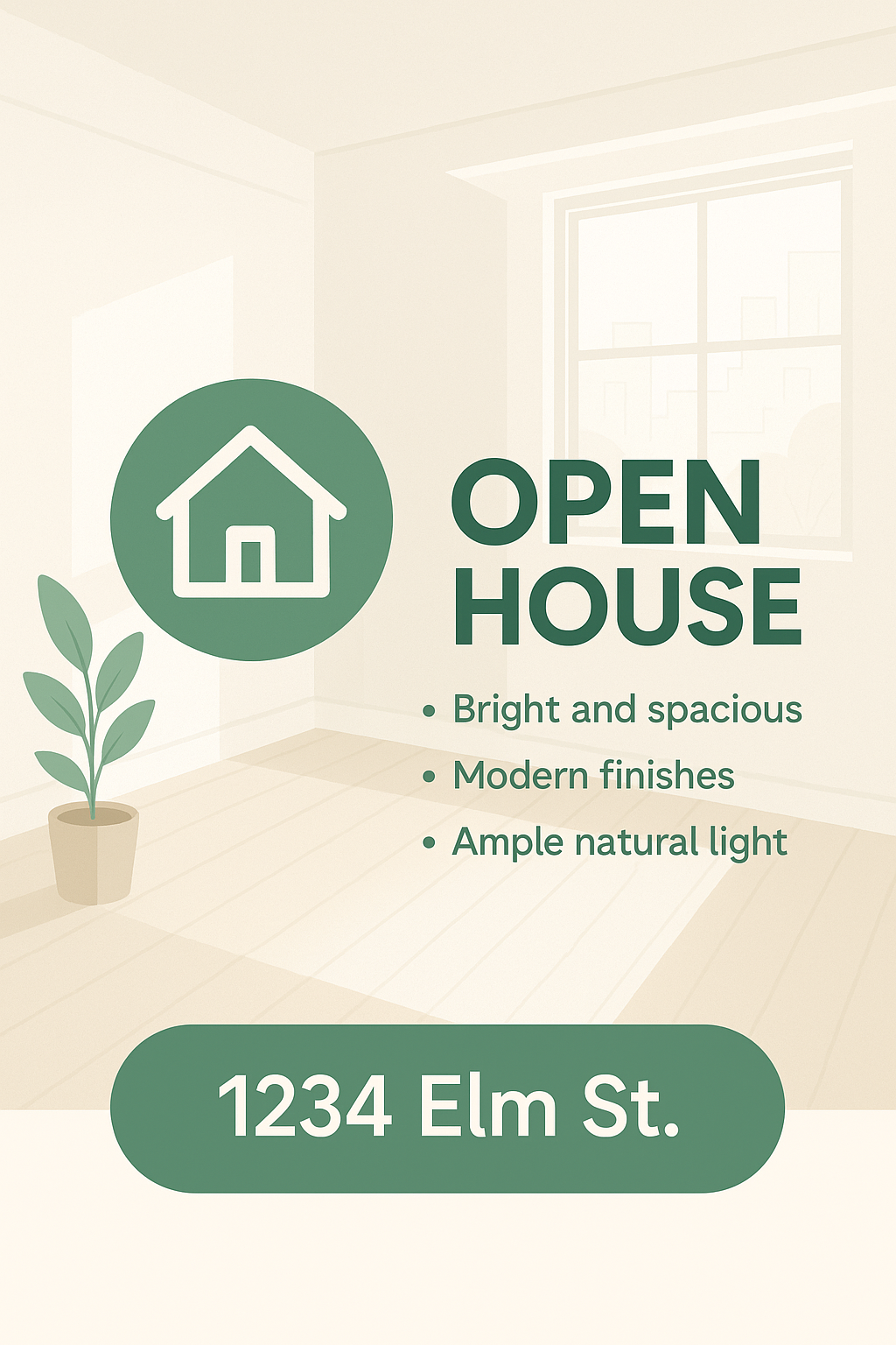 Modern open house promotional graphic featuring a spacious room with natural light and simple design elements, ideal for real estate marketing.