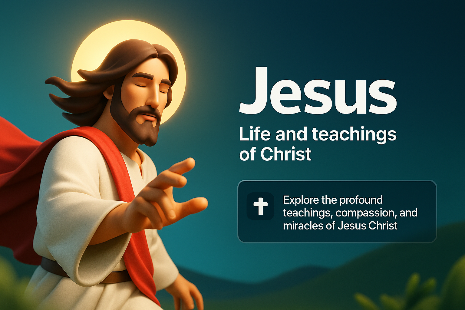 A vibrant 3D illustration of Jesus, showcasing His teachings and compassion with a serene background. The composition emphasizes depth and clarity.