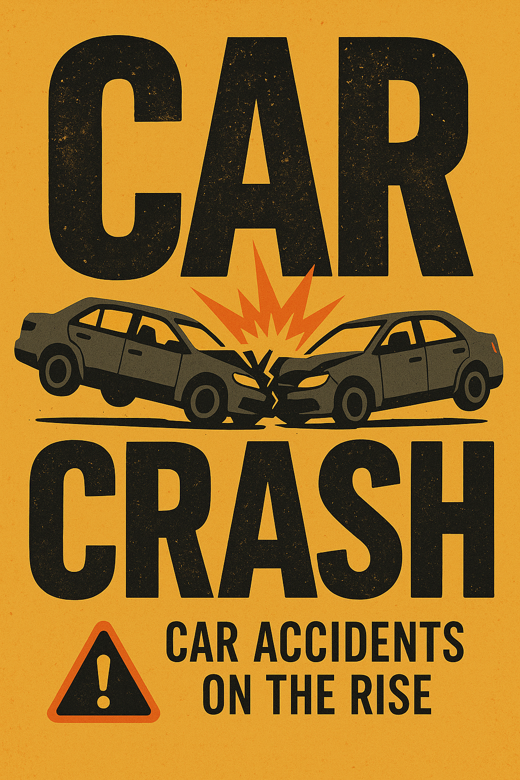 Bold awareness poster highlighting the rise in car accidents, featuring impactful typography and a clear visual theme. Ideal for safety campaigns.