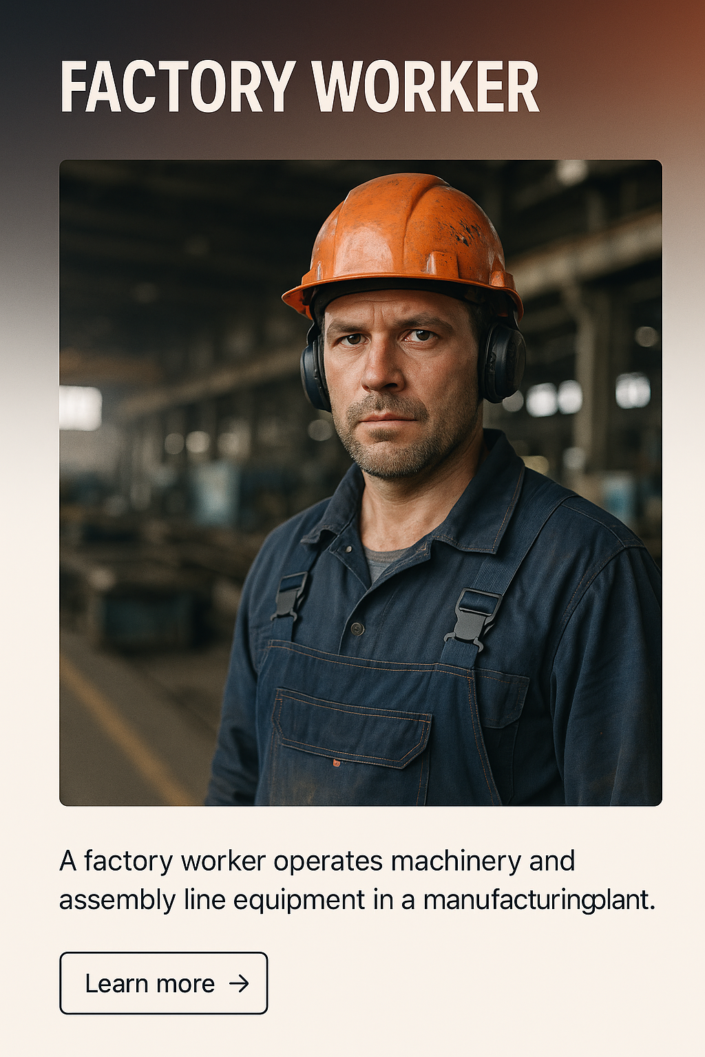 A factory worker in a helmet and headphones stands in a manufacturing plant, exuding professionalism. The background features a gradient from dark to white, enhancing focus on the worker.