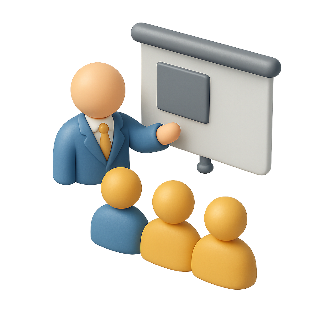 /Collection: /by davooda/Type: PNG/A 3D icon depicting a presenter in a suit gesturing towards a presentation screen, with three audience figures in front. The design features a transparent background and a volumetric 3D feel.